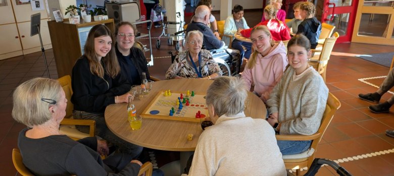 生徒と高齢者が一緒になって午後のゲームを楽しむ。